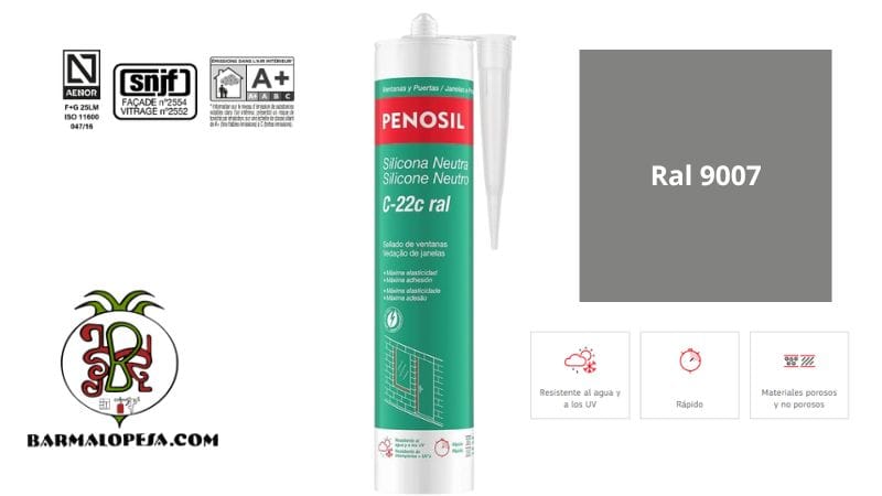Silicona aluminio gris RAL 9007 Penosil, sellante neutro de alta calidad, ideal para juntas en aluminio, ventanas, puertas y carpintería metálica. Resistente a intemperie y UV.